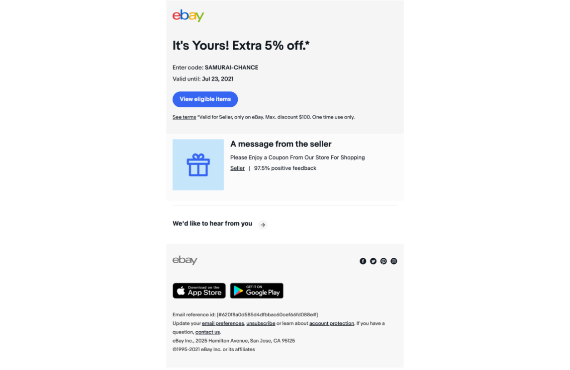 今年早些時候,eBay為使用eBay店鋪的賣家推出新的編碼優惠券工具 (coded coupons)。賣家可使用新工具透過eBay平台或自己的營銷渠道發送,列印和分享優惠券來向買家提供折扣。