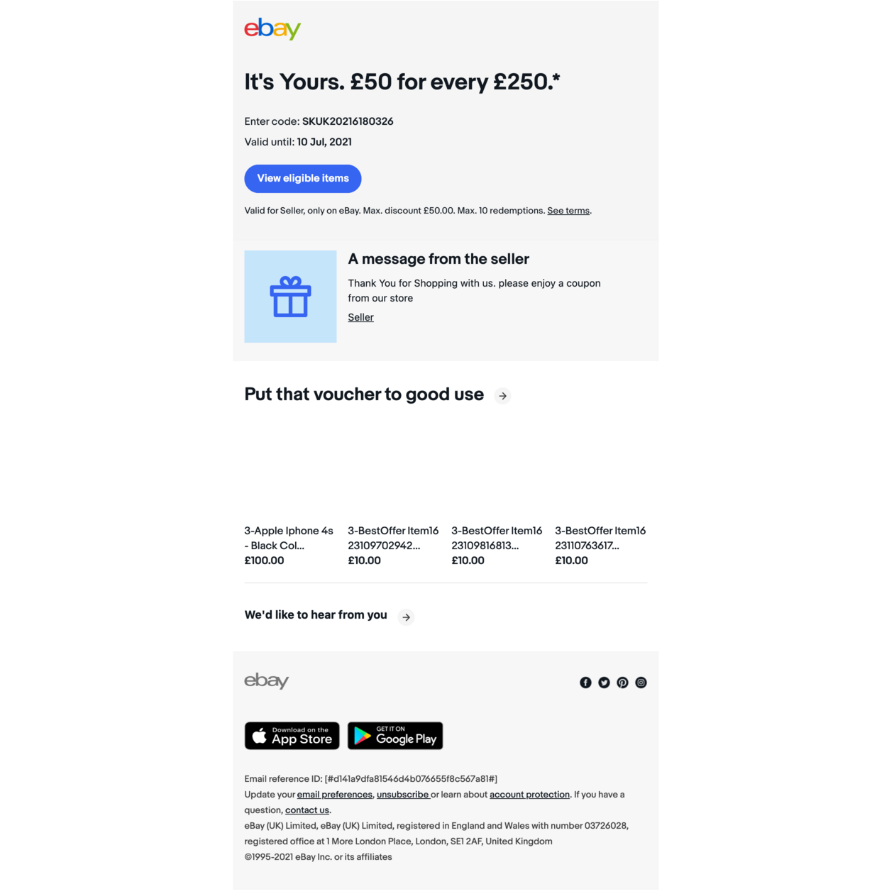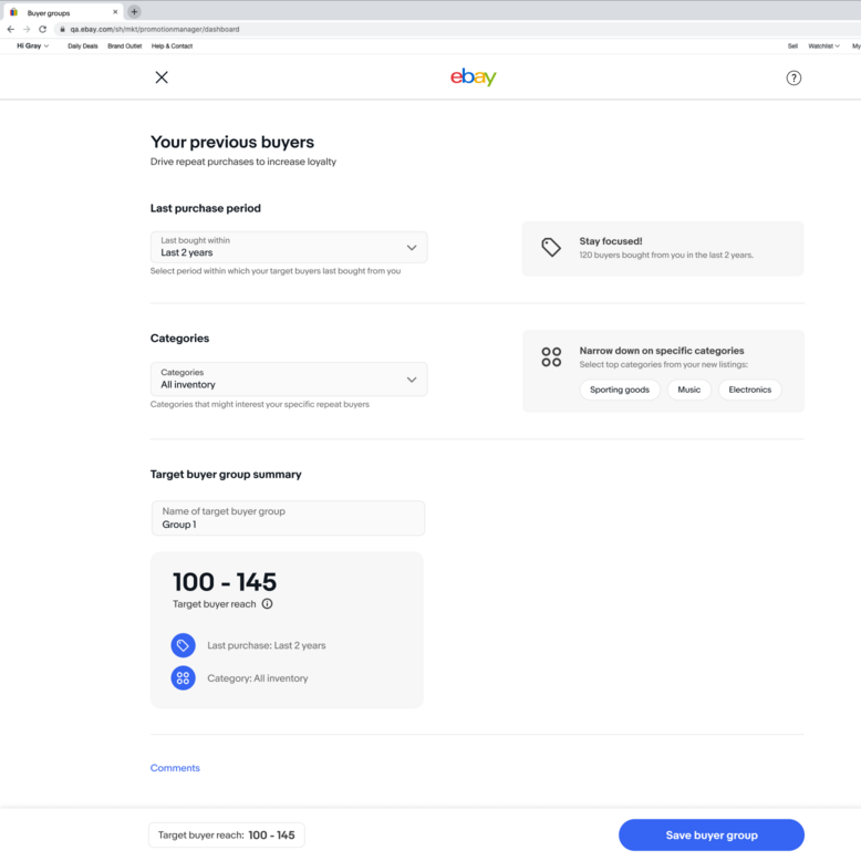 自2021年10月起,賣家可自賣家中心向特定買家群組發送定制優惠券代碼。今年早些時候,eBay為使用店鋪的賣家推出新的編碼優惠券工具。賣家可使用該新工具透過eBay平台或自己的營銷渠道發送,列印和分享優惠券來向買家提供折扣。