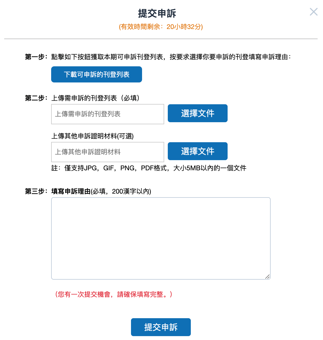 ● 請在倒數計時前提交申訴,注意已提交的申訴不可修改,每週僅有一次提交申訴的機會,請謹慎填寫並及時提交申訴文件。