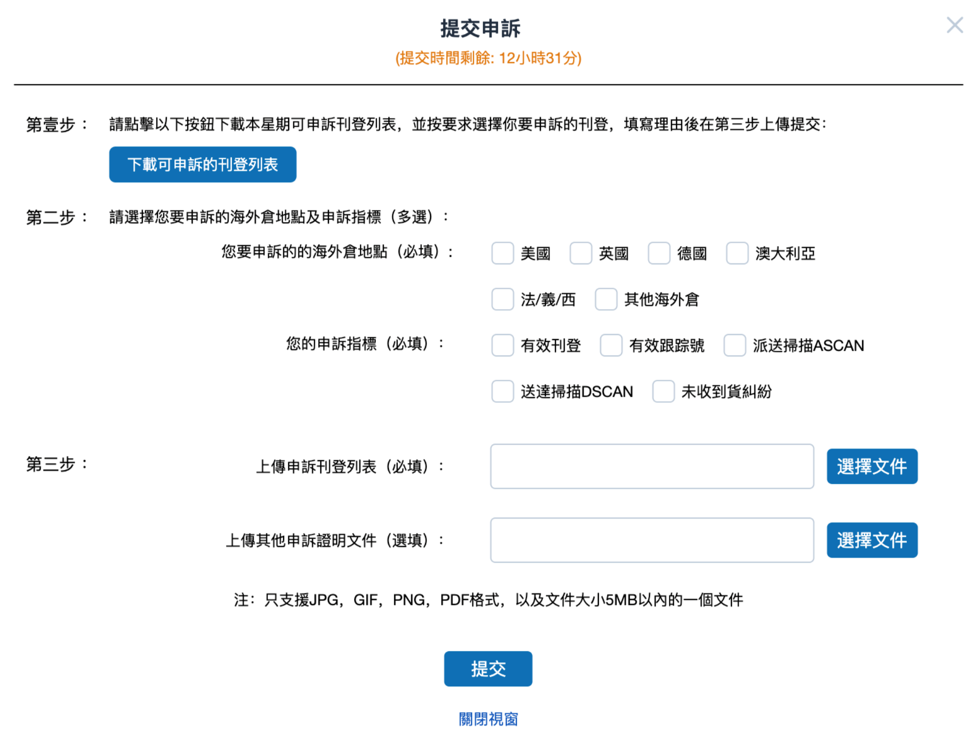 ● 上載已填寫申訴理由的「可申訴的刊登列表」和其他申訴證明材料(如有)