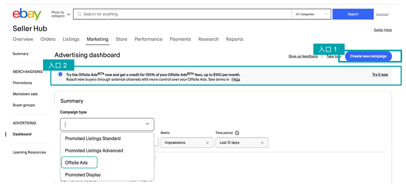 入口1:卖家中心(Seller Hub)-营销(Marketing) - 广告公告栏(Advertising dashboard)的下拉菜单里找到”offsite ads“,并点击“创建新广告活动(Create new campaign)”创建站外广告活动。