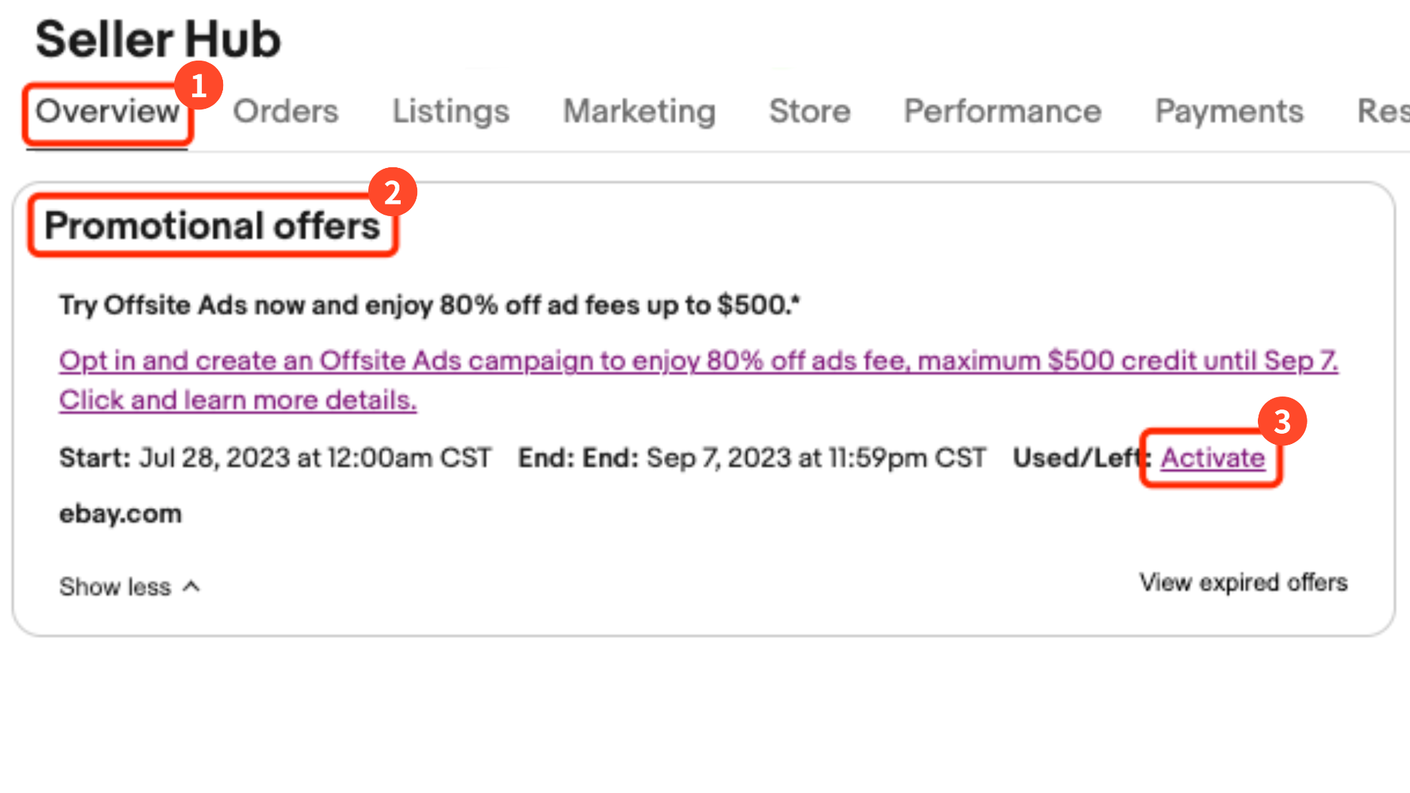 ● 路径一:卖家中心(Seller Hub)—概览(Overview)—优惠促销(Promotional Offers)—点击“激活”(Activate),参与本次促销活动(如下图步骤所示)