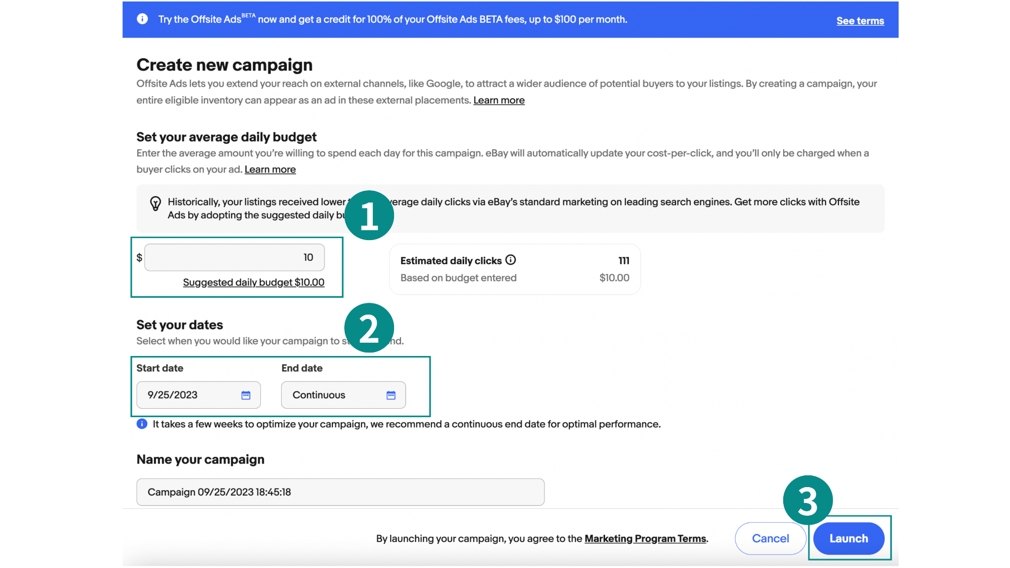 eBay誠邀您創建站外廣告活動! 只要您在於2023年11月1日00時00分至2023年12月31日23時59分前,點擊賣家中心(Seller Hub)活動參與連結,並開啟站外廣告活動(Offsite Ads),即可立即享有站外廣告費用2折折扣, 最高可獲得500美元/英鎊/歐元/澳元的站外廣告費用抵扣(見注1)(賣家由點擊活動參與連結起計24小時後,其eBay帳號之站外廣告產生的費用將會實時抵扣,賣家無需實際支付已經抵扣的廣告費用)。