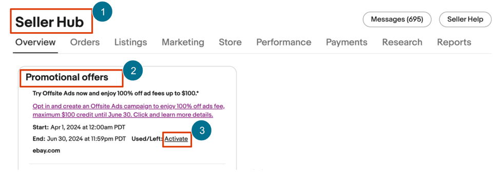 To qualify for an Incentive payment, you must, during the Promotion Period and using this eBay account, meet or exceed the following: Follow either of the options below to participate in the Promotion and 24 hours after clicking on the Promotion Participation Link, you will start enjoying the Incentive. Participation Route 1: Click on the “Promotion Participation Link” in the “Promotional Offers Tab” on your Seller Hub. ● I.e. click through: Seller Hub > Overview > Promotional offers > Activate