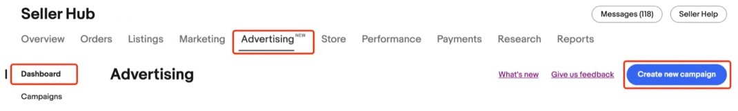 Entry: Seller Hub - Marketing - Dashboard, click “Create new campaign” to setup your Promoted Offsite campaign.