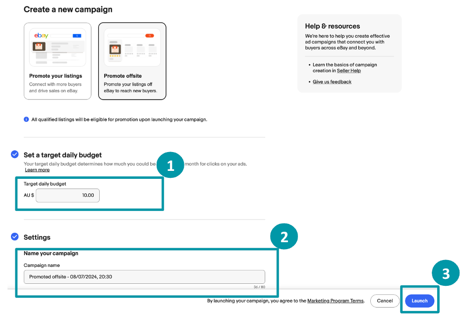 3 easy steps to complete the setup. Step 1: Set a target daily budget. Step 2: Name your campaign. Step 3: Click “Launch" to complete the setup.