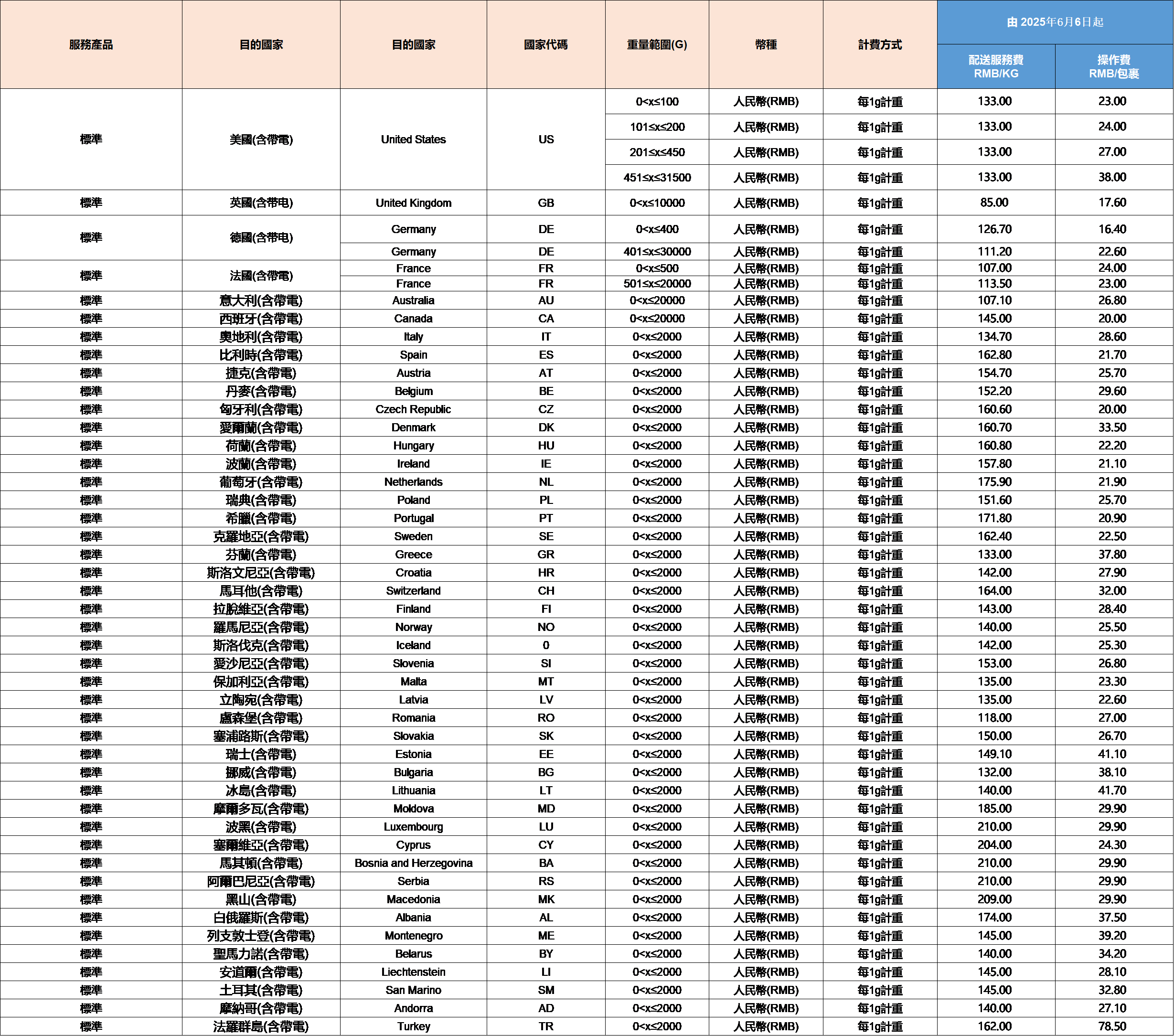 * 以上各國標準服務價格亦適用於各國標準型帶電包裹,如有變更,另行通知。