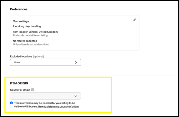 如需在單個物品層面修改,請轉至「修改物品刊登」頁面,滾動至「物品原產地」部分,然後新增或更新「原產國」。