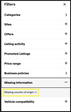 提示:賣家可以篩選缺少「原產國」資訊的物品刊登。點擊「所有篩選條件」,展開篩選選項,並應用相應的篩選條件。