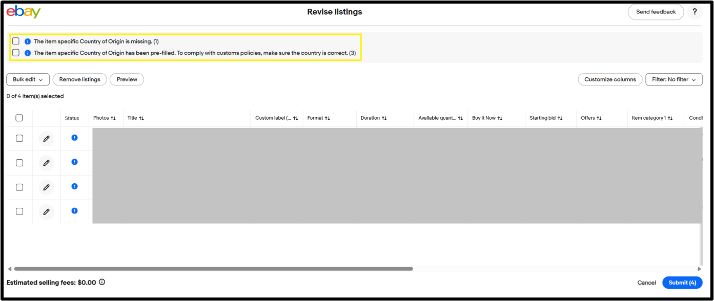 2. 「物品屬性‘原產國(Country of Origin)’已預先填充。為符合海關政策,請確保所填寫的國家資訊準確無誤。(3)」——在有些情形下,系統能夠預測出原產國並為賣家預先填充。此提示表明有3個物品刊登的原產國資訊已預先填充,賣家需要進行核對。」