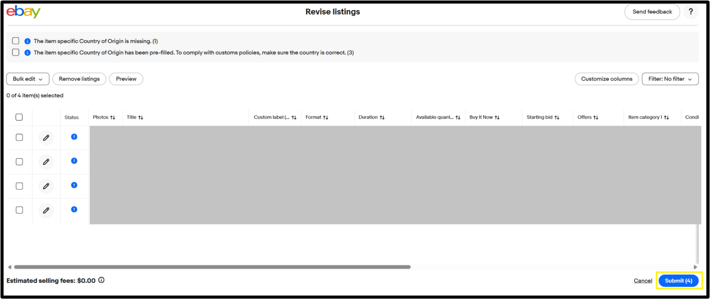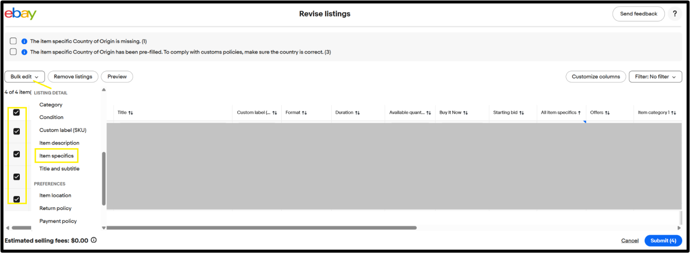 如需修改多個物品刊登,請轉至「賣家中心 >線上刊登」,選擇需要新增或更新「原產國」字段的物品刊登,點擊「修改所有X物品刊登」,然後繼續完成批量修改流程。