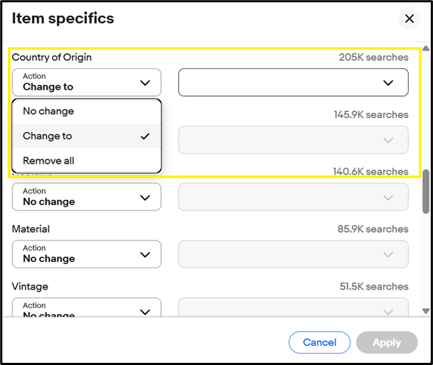 如需進行批量更新,請點選想要修改的物品刊登對應的點選,點擊「批量修改」下拉選單,然後選擇「物品屬性」。賣家的選擇將依品類進行分組。展開一個品類,找到「原產國」字段,點擊「更改為」,並選擇正確的國家。點擊「應用」以確認並儲存更新。