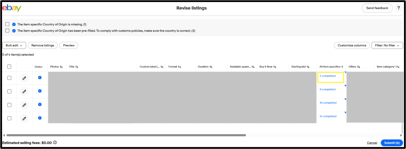賣家可以在每個物品的「物品屬性(Item Specifics)」部分找到「原產國」字段。點擊「X已完成」,查看和修改物品屬性的完整列表。