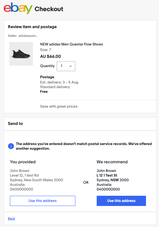 當在eBay平台上購買物品時,買家可能會看到eBay提供的位址建議(請參見右側示例)。 此外,在接下來的幾周內,如果eBay在您的收貨位址中發現了微小的錯誤,eBay將代表您自動更正郊區和所在地資訊。 eBay不會更改任何其他註冊詳情。