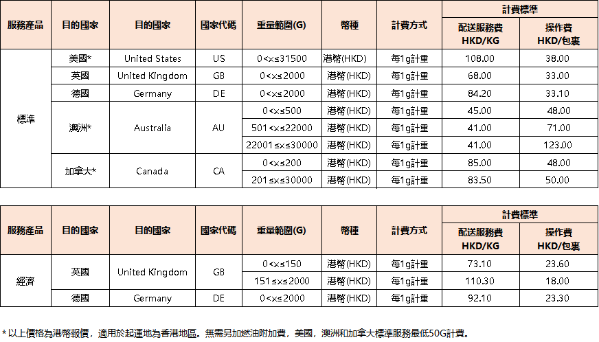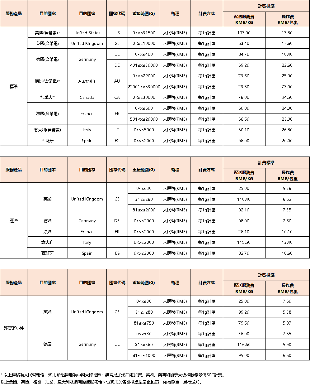 具體運費調整如下:
