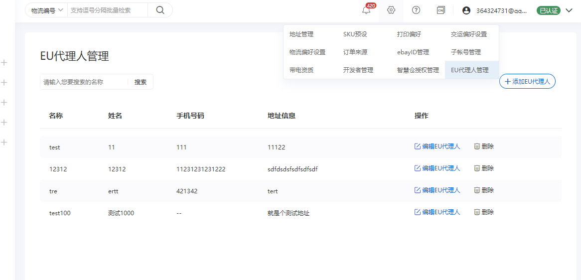 頁面包含「添加EU代理人」、「編輯EU代理人」、「刪除」、「搜尋」操作,點擊刪除可刪除當前EU代理人,搜索框輸入對應名稱,點擊搜索可以找到對應EU代理人。