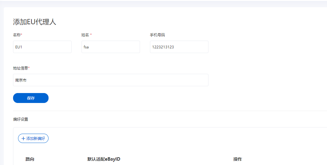 點擊「添加EU代理人」按鈕,進入到添加EU代理人頁面,填寫資訊點擊保存即可。