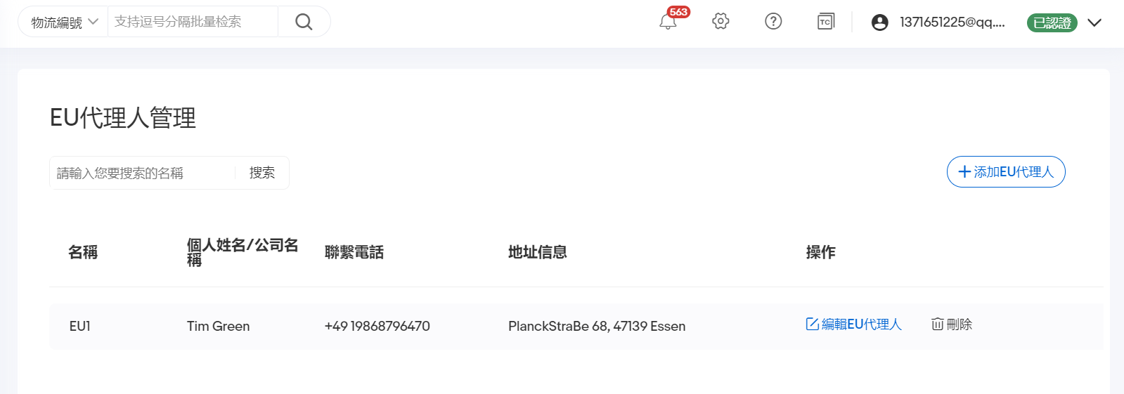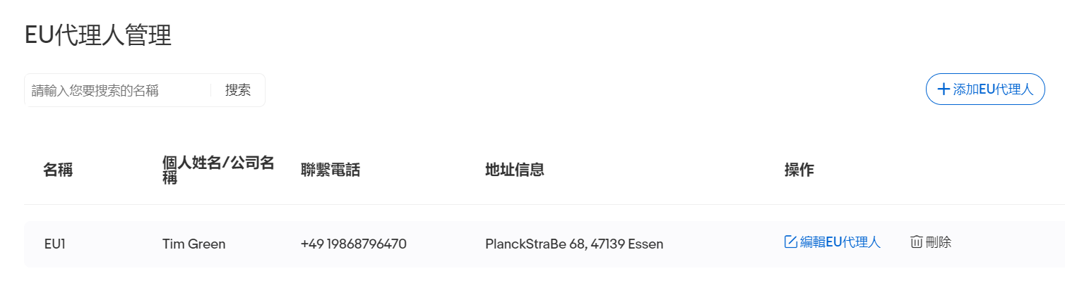 頁面包含「添加EU代理人」、「編輯EU代理人」、「刪除」、「搜索」 操作。 點擊「刪除」 ,可移除目前的 EU 代理人;搜尋框輸入對應名稱,點擊「搜尋」可以找到對應 EU 代理人。
