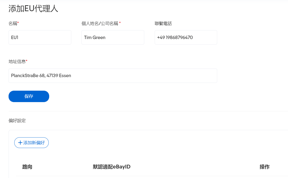 "新增偏好「 功能用於為填寫的EU代理人,綁定相關路向的eBayID。 如AddPackage未上傳EU代理人數據,將根據偏好設定做匹配處理。