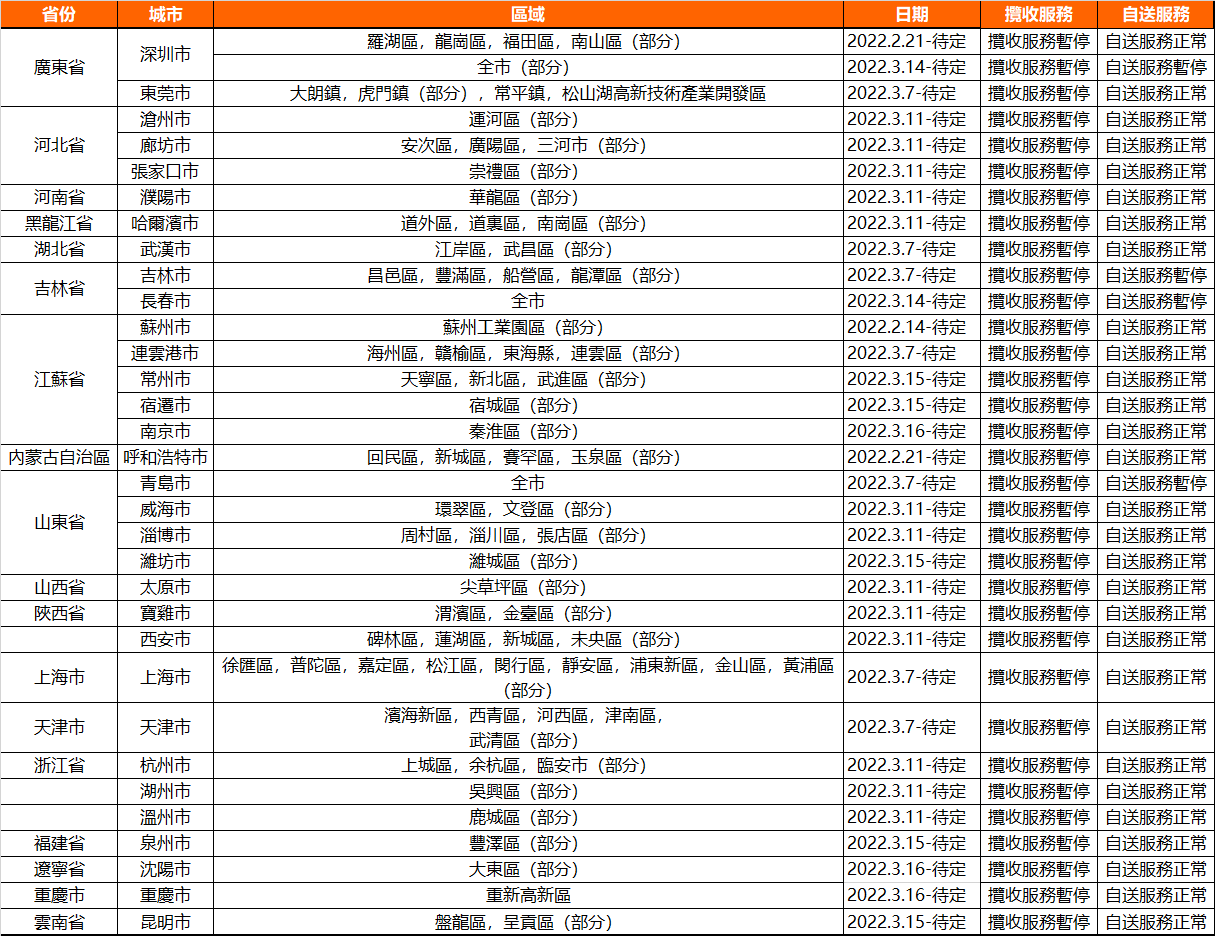 受新冠疫情影響,中國內地現有20個高風險及347個中風險地區,部分區域已採取全面防控措施,並對部分地區及交通實施封閉管控。受此影響,為了配合做好疫情防控工作,若賣家的SpeedPAK包裹涉及風險都市或區域, 相關攬收及/或轉運服務可能受到不同程度影響。請各位賣家密切關注相關的橙聯官網資訊,並和買家及時溝通。