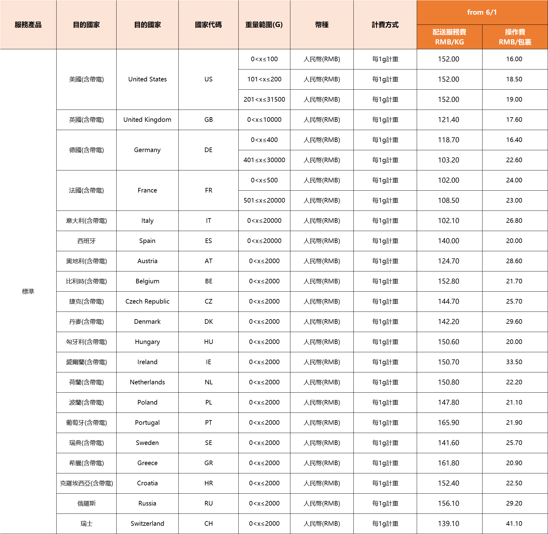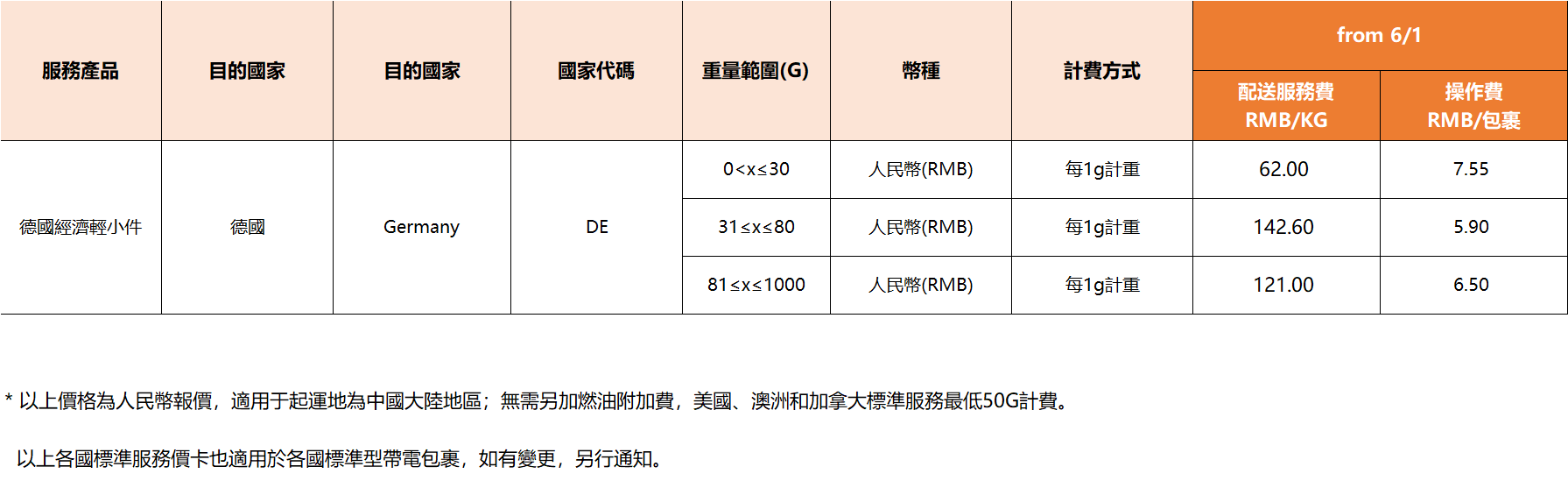 具體運費調整如下: