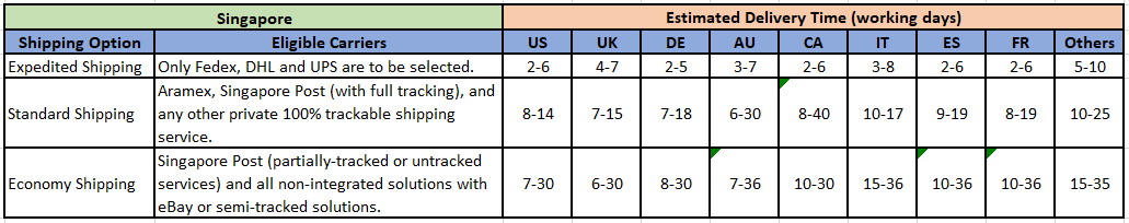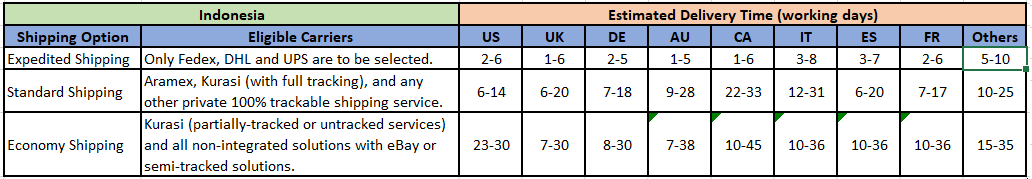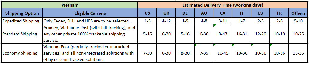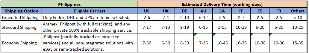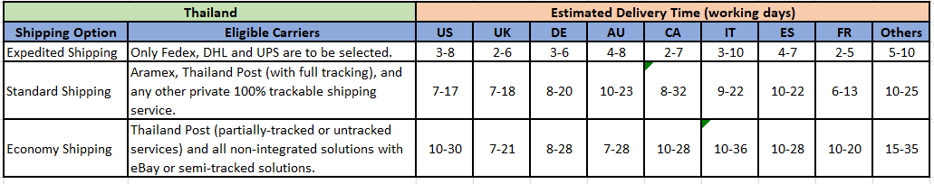 If you are listed on other sites, please refer to the table below to set the logistics and transportation time options.